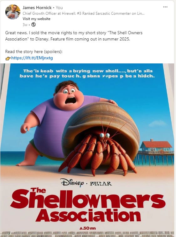 For context: I started writing fiction as a hobby last year. I got my first story “The Shell Owners Association” published in an online publication, Sci-Fi Shorts. As a joke (and to encourage people to read my masterfully written 800 word satirical take on the housing crisis through the eyes of hermit crabs), I made the following post. It linked to the story (and included an AI generated faux Pixar poster - oh the irony.) Here.